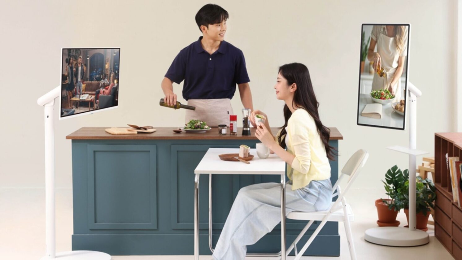 O design também chama atenção. O produto tem bordas finas e simétricas, acabamento minimalista e está disponível na cor “Branco Quente”. Essa cor combina com diversos estilos de decoração. Na prática, o modelo utiliza como base o Smart Monitor M7, já conhecido do público. Agora, ele é montado em um suporte da linha Moving Style, o que transforma completamente a proposta de uso.